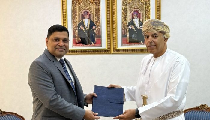 প্রবাস বাংলা ডেস্ক: ওমানের পররাষ্ট্র মন্ত্রণালয়ের প্রশাসনিক ও অর্থনীতিক বিষয়ক আন্ডার সেক্রেটারি খালিদ হাশিল আল মুসালহির কাছে নিজের পরিচয়পত্র প্রদান করেছেন ওমানে নিযুক্ত বাংলাদেশের নতুন রাষ্ট্রদূত রিয়ার এডমিরাল খন্দোকার মিসবাহ-উল-আজিম, এনপিপি, এনডিইউ, এএফডব্লিউসি, পিএসসি, পিএইচডি।