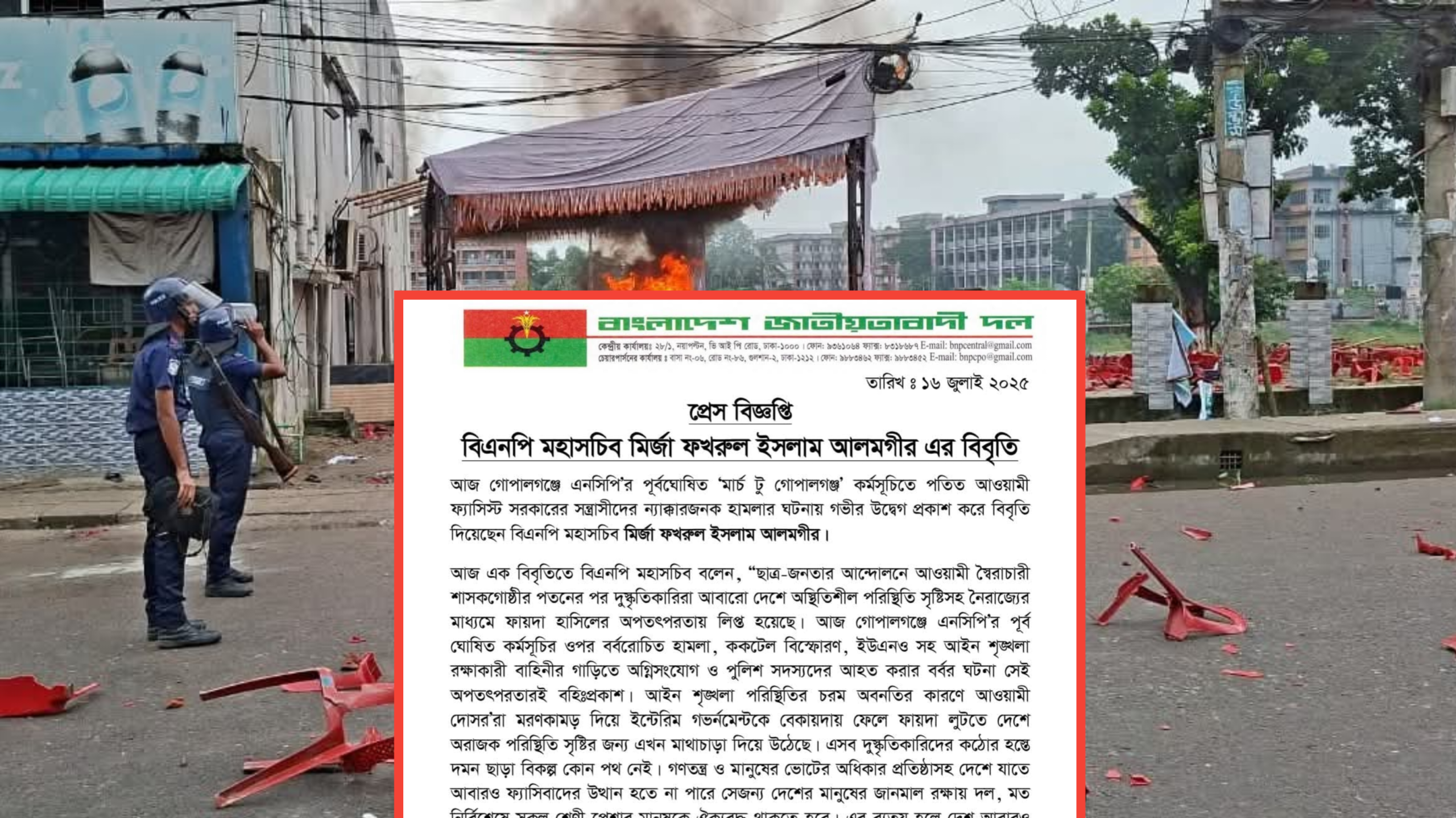 বিএনপি মহাসচিব বিবৃতিতে গোপালগঞ্জে এনসিপি’র পূর্বঘোষিত কর্মসূচিতে হামলাকারী দুস্কৃতিকারিদের অবিলম্বে গ্রেফতার ও দৃষ্টান্তমূলক শাস্তির জোর আহবান জানান। তিনি আহত পুলিশ সদস্যদের আশু সুস্থতা কামনা করেন।