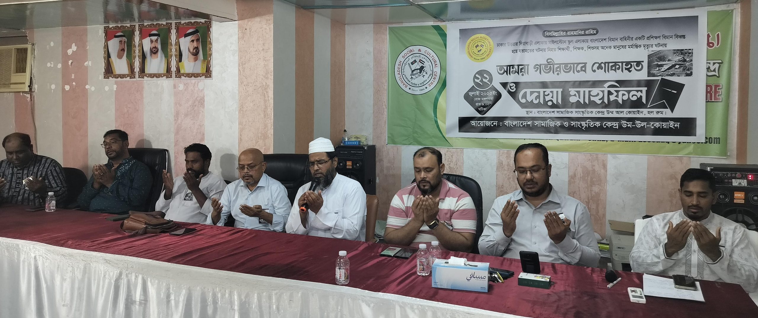 গত২২জুলাই ২০২৫ ইং রোজ মঙ্গলবার রাত দশটায় বাংলাদেশ সামাজিক ও সাংস্কৃতিক কেন্দ্র উম্মা আল কোয়াইন হলরুমের অনুষ্ঠিত শোক সভাই সংগঠনের সভাপতি মুজিবুর রহমান সভাপতিত্বে ও সাংগঠনিক সম্পাদক নাহীদ জামান নাসির এর সঞ্চালনায় উপস্থিত ছিলেন সংগঠনে সাধারণ সম্পাদক আবদুল মালেক,যুগ্ন সাধারন সম্পাদক ওমর ফারুক কপিল,এ সময় আরো উপস্থিত ছিলেন সংগঠনের সহ-সভাপতি হারুন রশিদ,শামীম আহমেদ,মইনুল ইসলাম,