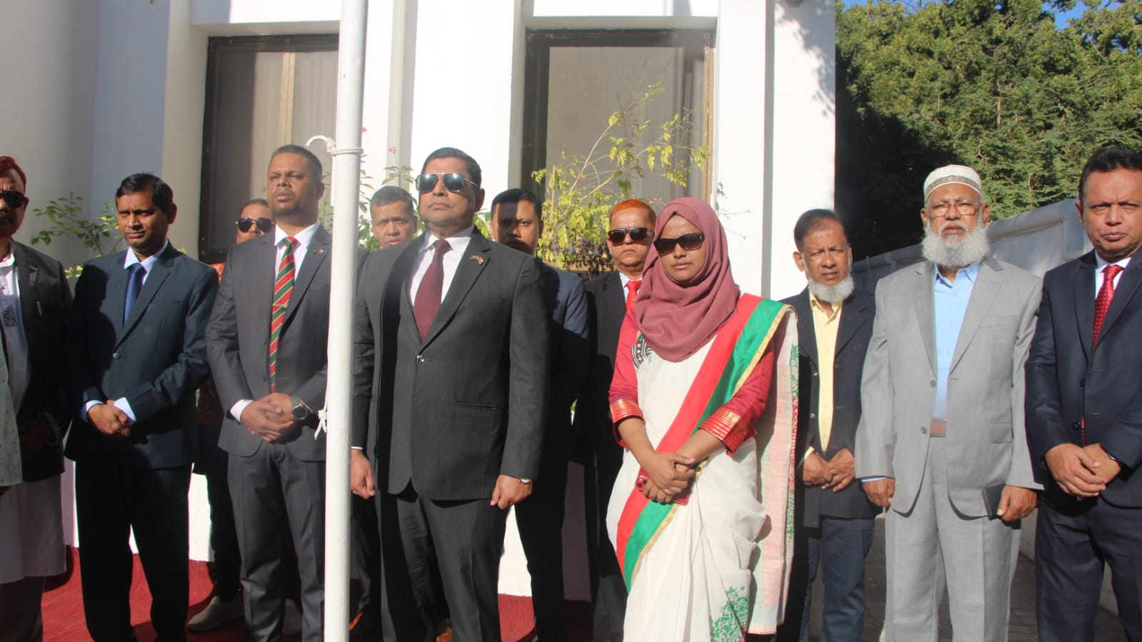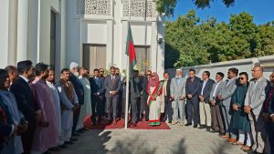 পতাকা উত্তোলন শেষে দূতাবাস প্রাঙ্গণে স্থাপিত অস্থায়ী শহীদ মিনারে জাতির শ্রেষ্ঠ সন্তানদের স্মরণে পুষ্পার্ঘ্য অর্পণ করা হয়। মহান মুক্তিযুদ্ধে শহীদদের প্রতি গভীর শ্রদ্ধা জানাতে উপস্থিত সবাই এক মিনিট নীরবতা পালন করেন।