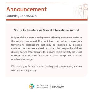 এমতাবস্থায়, যেসব যাত্রী মাস্কাট আন্তর্জাতিক বিমানবন্দর হয়ে ভ্রমণের পরিকল্পনা করেছেন—বিশেষ করে মধ্যপ্রাচ্য ও সংশ্লিষ্ট অঞ্চলের গন্তব্যে—তাদের বিমানবন্দরে রওনা হওয়ার পূর্বে নিজ নিজ এয়ারলাইনের সঙ্গে সরাসরি যোগাযোগ করে সর্বশেষ ফ্লাইট আপডেট নিশ্চিত করার জন্য অনুরোধ করা হচ্ছে।